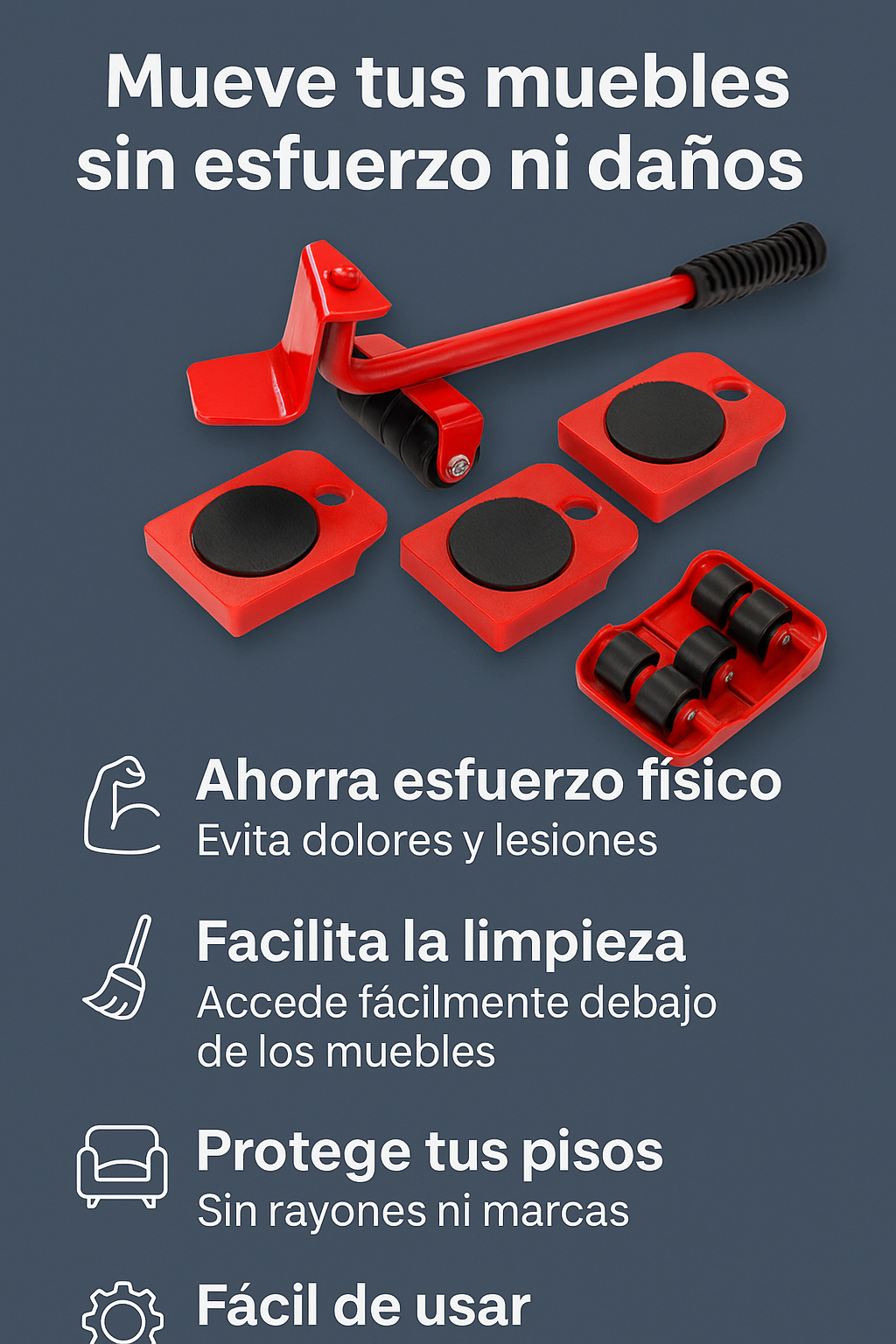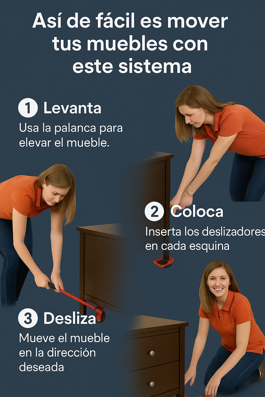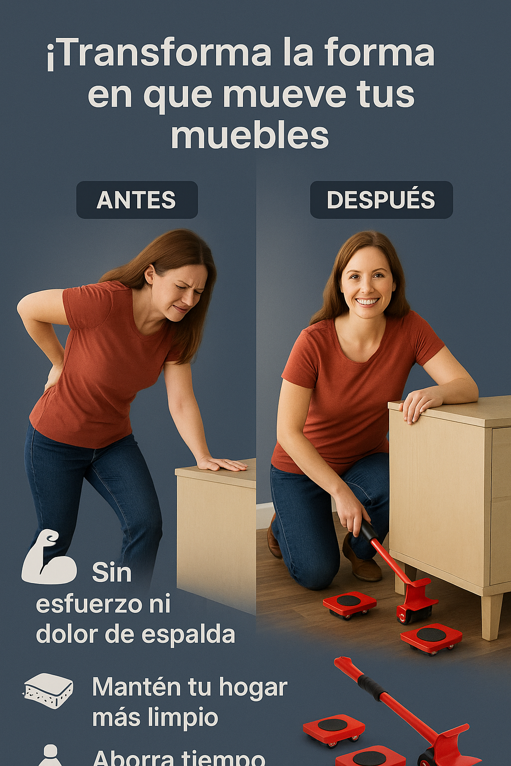 Levantamiento sin esfuerzo:El elevador con ruedas y los 4 motores de esquina con ruedas te permiten levantar o mover muebles pesados sin esfuerzo, incluso en espacios reducidos.