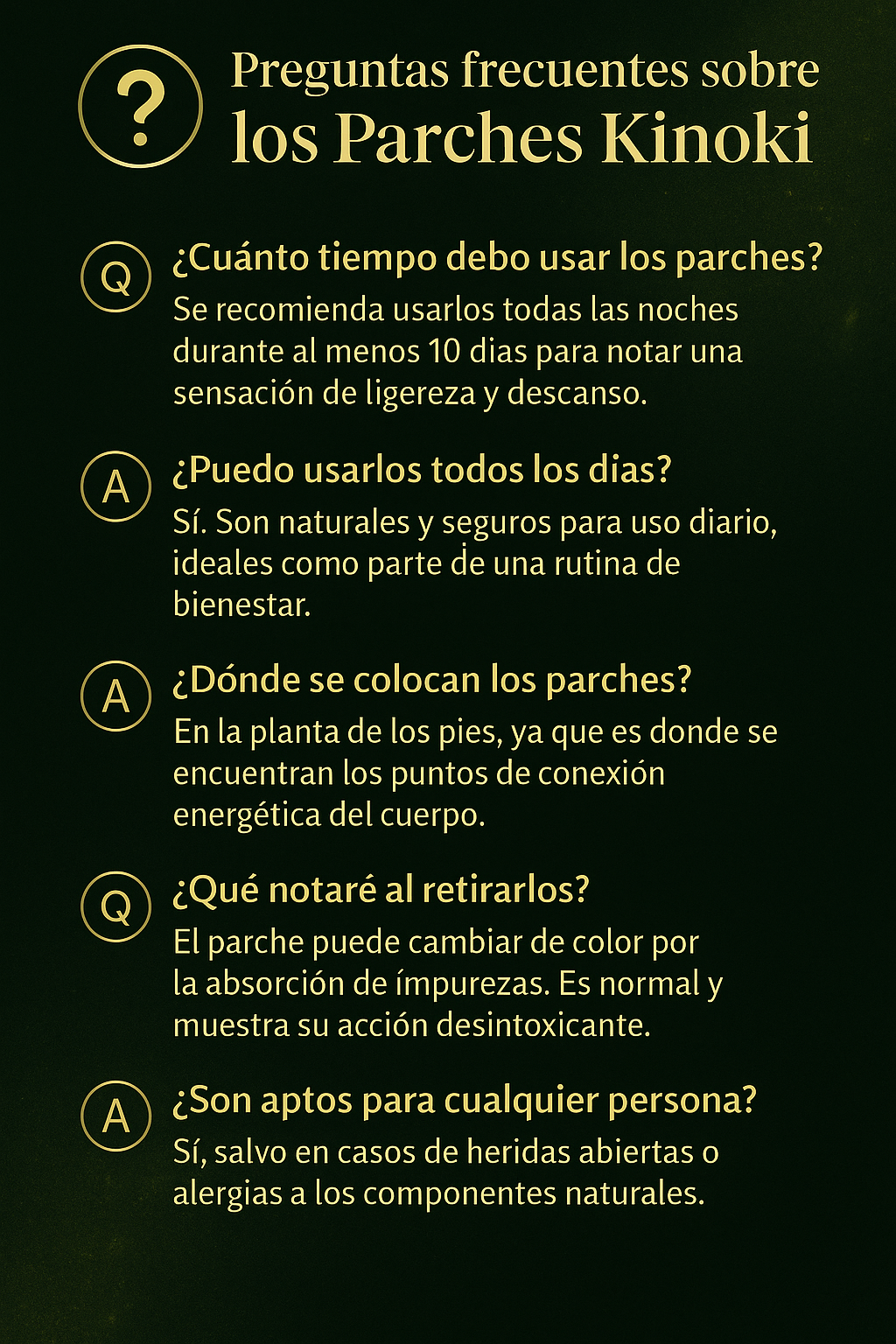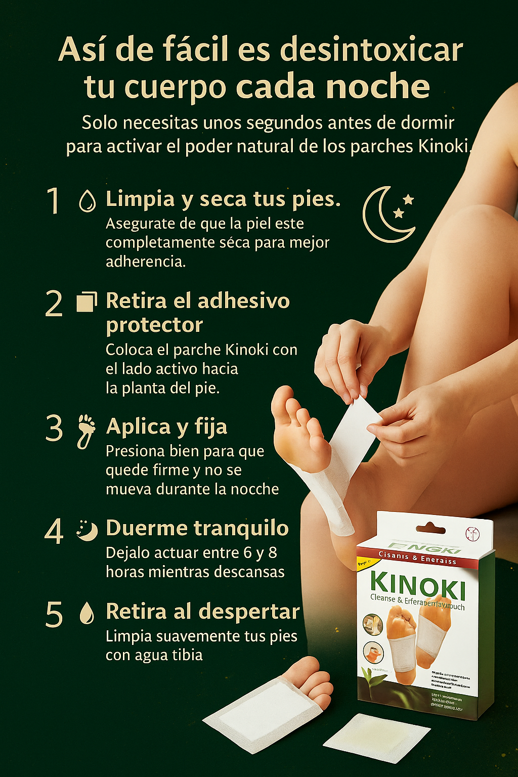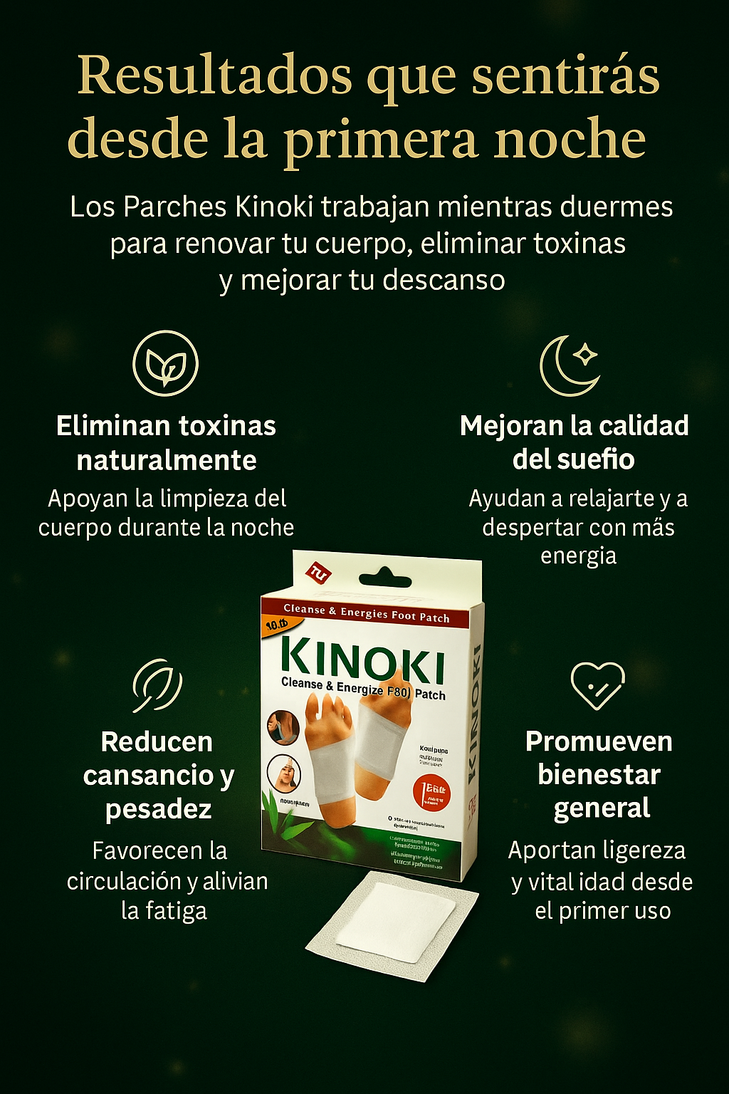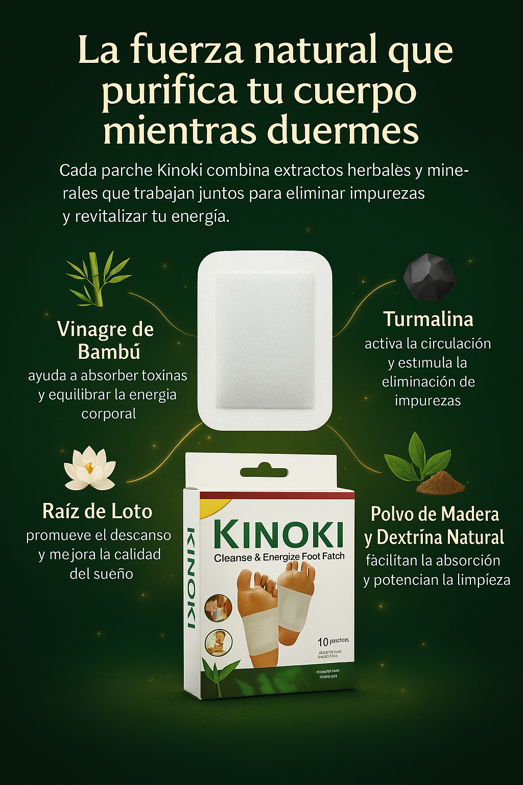 LosParches Desintoxicantes Kinokiestán diseñados para actuar durante la noche, cuando el cuerpo descansa, promoviendo una sensación de ligereza, bienestar y renovación. Su fórmula basada en ingredientes herbales y minerales, como vinagre de bambú, turmalina y raíz de loto, se activa con el calor del cuerpo para apoyar el proceso natural de limpieza interna.