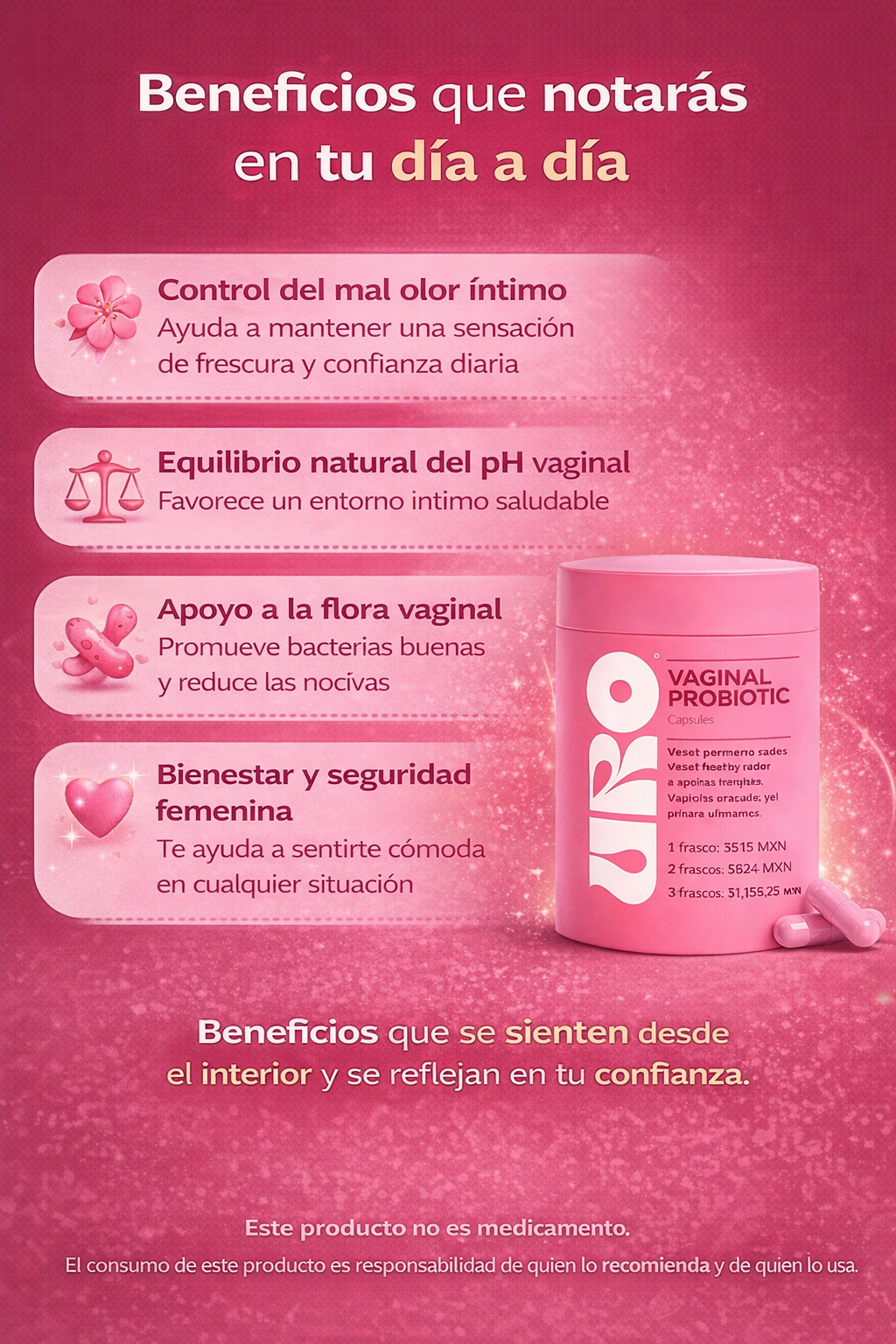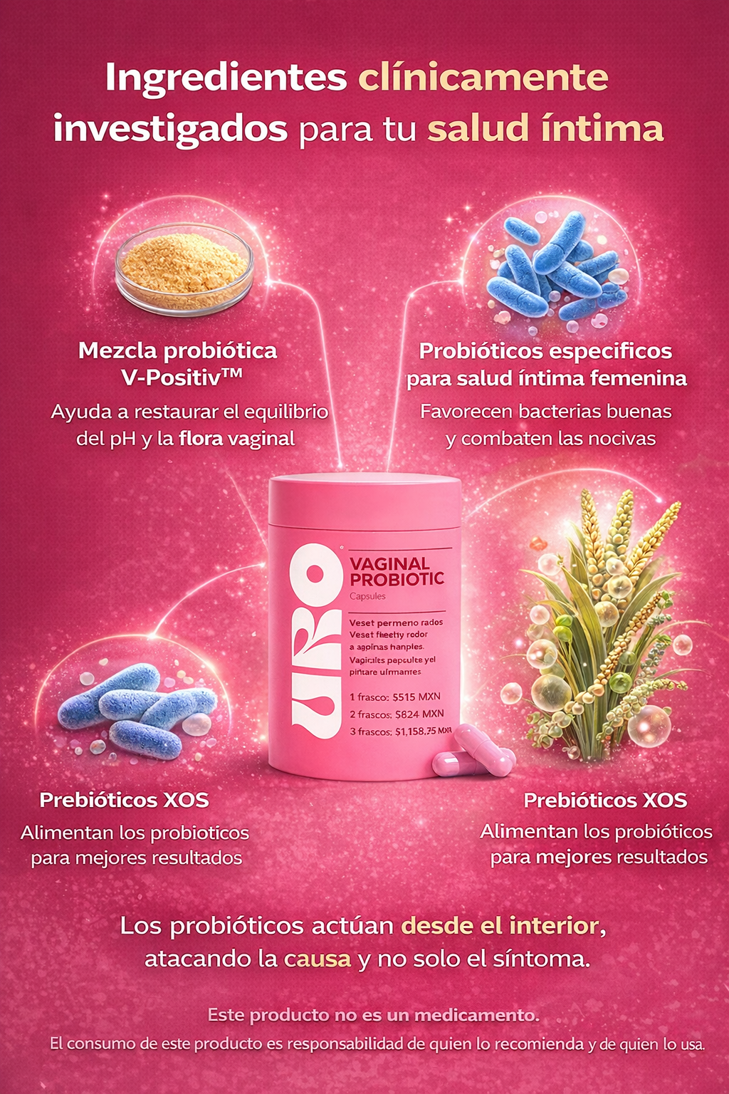 - La ciencia detrás de URO: combina nuestra mezcla probiótica patentada V-Positiv con prebióticos XOS. Cuando el pH natural se vuelve demasiado básico, aparecen más bacterias nocivas y causantes de malos olores. Los ingredientes probióticos de URO ayudan a eliminar las bacterias nocivas y favorecen el equilibrio del pH, la salud y el olor saludable de la mujer.